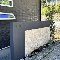 道路面は門柱のみしか設置できない状況でしたので、門柱のサイズを大きめにし、花壇とシンボルツリーで建物を引き立てました。