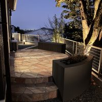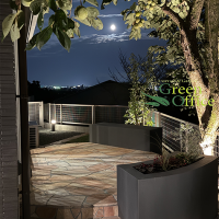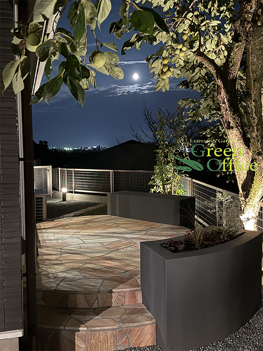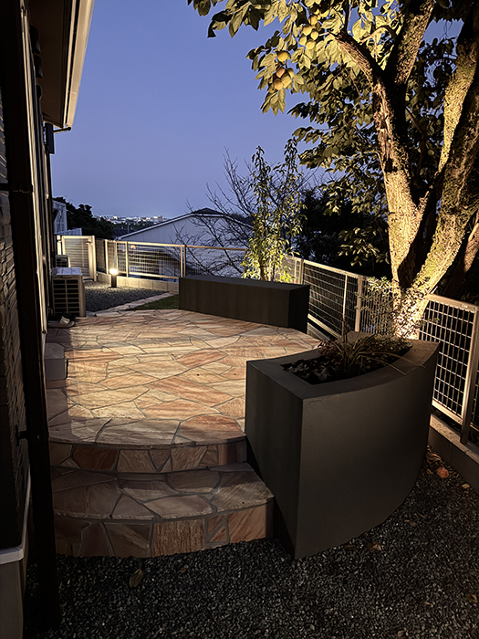 ガーデンはドッグランとして使えるようにクローズガーデンとし、自然石貼り(クォーツサイトピンク)のオーバル型のテラスを設置し、ベンチに腰を掛けワンちゃんとの時間をゆっくり過ごせるように計画しました。さらにワンちゃんのために、人工芝ではなく天然芝(ヒメコウライ)を貼り、ワンちゃんファーストなお庭に仕上げました。