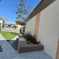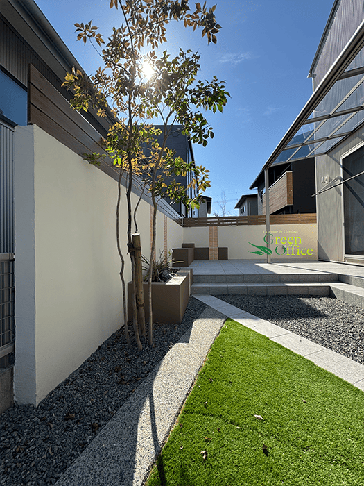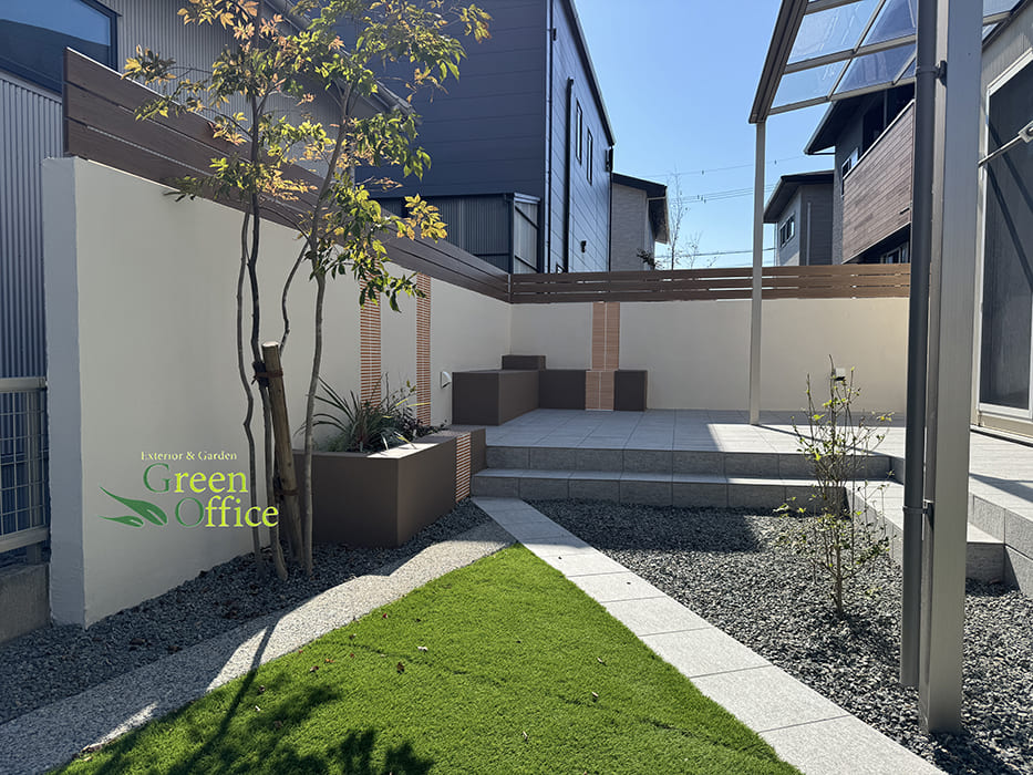テラスを敷地の南西側に配置し隣地境界にウォールの上にルーバーフェンスを造作して、プライバシーを確保し、テラスにベンチとカウンター配置し、アウトドアリビングとしての空間を作りました。残りの東側の空間は人工芝と砂利敷きにし雑草対策をしお庭全体をローメンテナンスに仕上げました。
